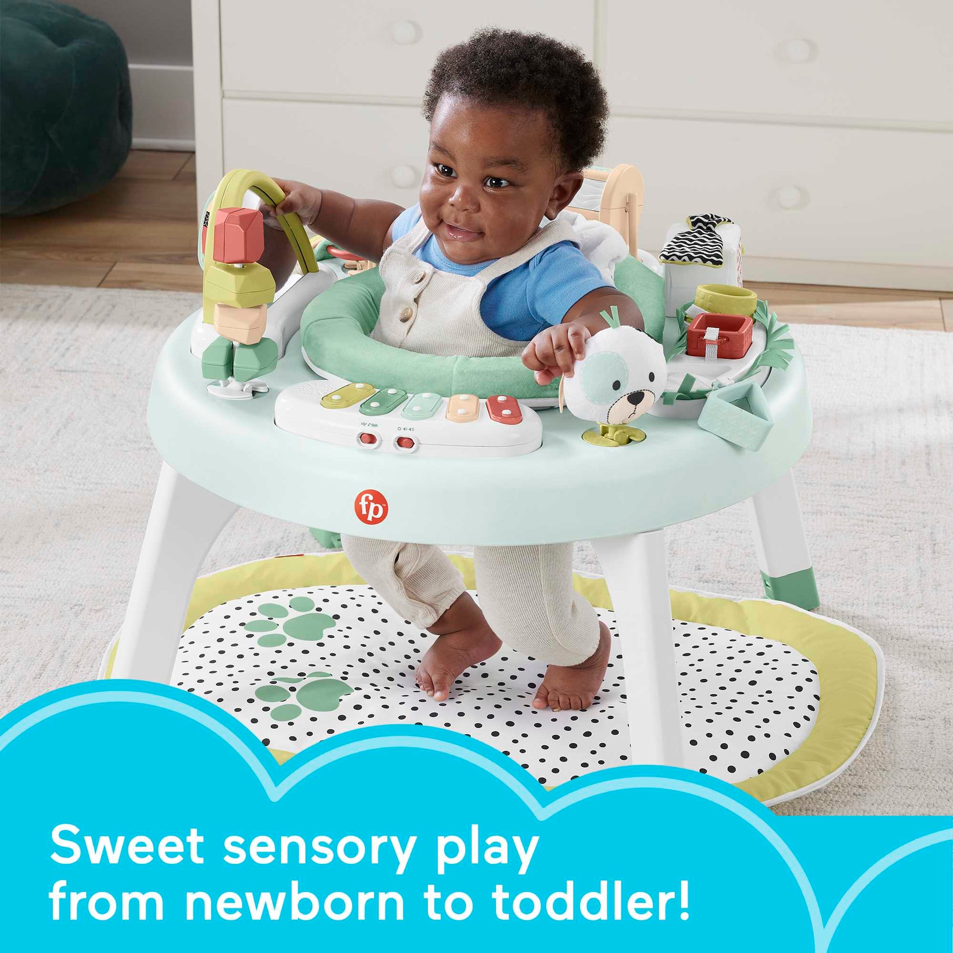 TheFisher-Price 3-in-1 SnugaPuppy Activity Center keeps playtime going and growingalong with your baby from tummy time to sitting and spinning to standing andcruising all around. The soft play mat gives newborns space to stretch, whilethe spinning seat gives babies all-around access to a variety of sensory toysand activities, including a light-up xylophone with up to 18 minutes of music!As they grow, toddlers can stand and explore all their favorite activitiesaround the table. Activity center max weight25 lb/ 11,3 kg. Use only for a child who is able to hold head uprightunassisted and who is not able to walk or climb out of product.