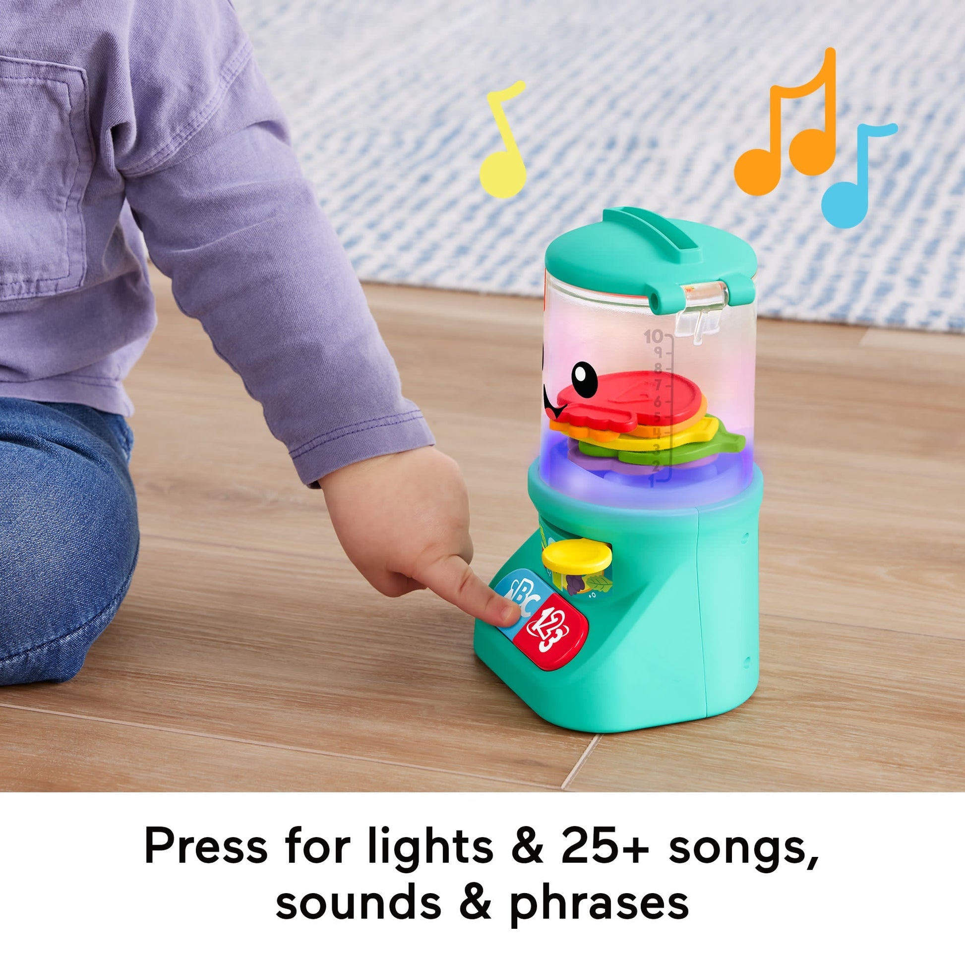 Baby can whip up fresh learning fun with the Laugh & Learn® Counting & Colors Smoothie Maker™ musical toy from Fisher-Price®. The pretend blender comes with 5 fruit and veggie pieces and features multi-color lights, music and educational phrases for engaging play. Toddlers can press the buttons on the blender to get the learning party started, slot the smoothie ingredients inside, then slide the lever to see them spin around!